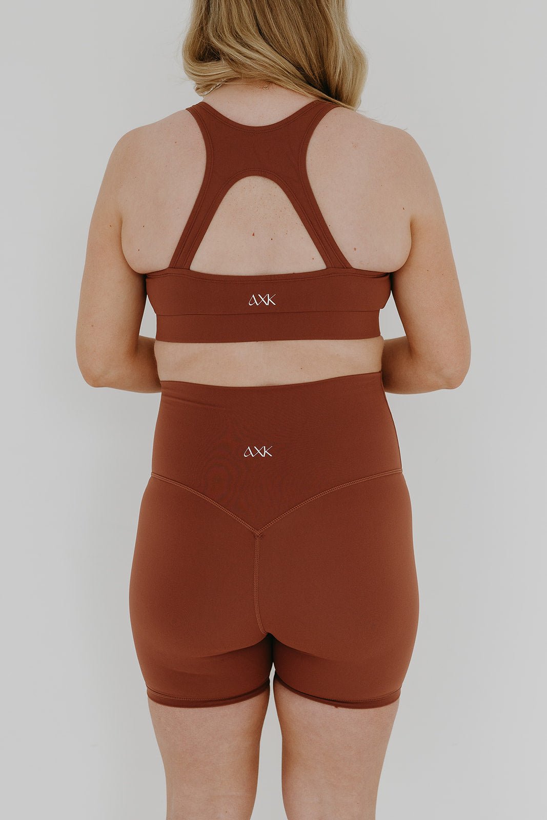 Pregnant woman wearing premium brown maternity bike shorts with a supportive high waist and matching high-impact, racerback maternity and nursing sports bra, standing against a white background. Premium maternity athletic and activewear by AXK - high quality petite, tall, and plus size maternity.